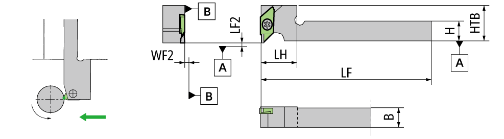 Diagram shows right-hand tool. NOTE: Use a right-handed (R) insert.