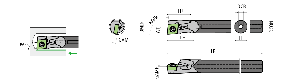 Diagram shows right-hand tool. Use a left-handed insert. F1 chipbreaker evacuates chips BACKWARD.