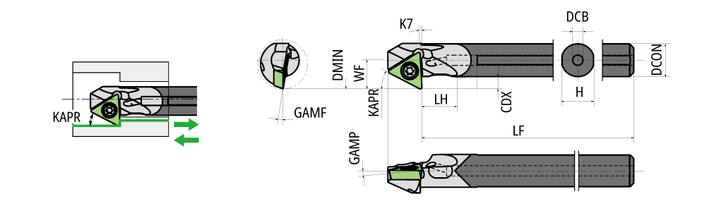 Diagram shows right-hand tool. Use right-hand inserts for machining backward. Use left-hand inserts for machining forward.